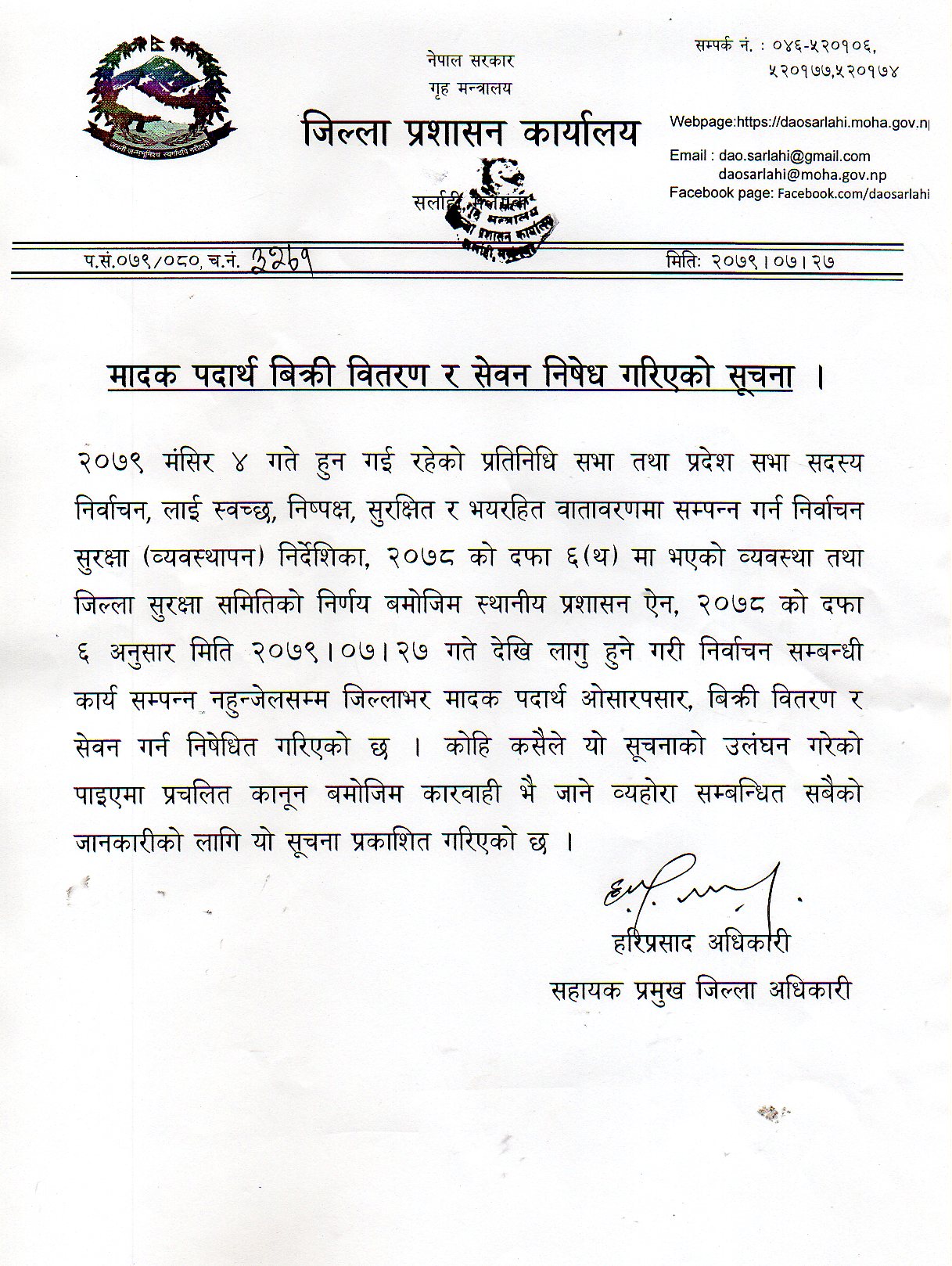 जिल्ला प्रशासन कार्यालय, सर्लाहीको विज्ञप्ती ।