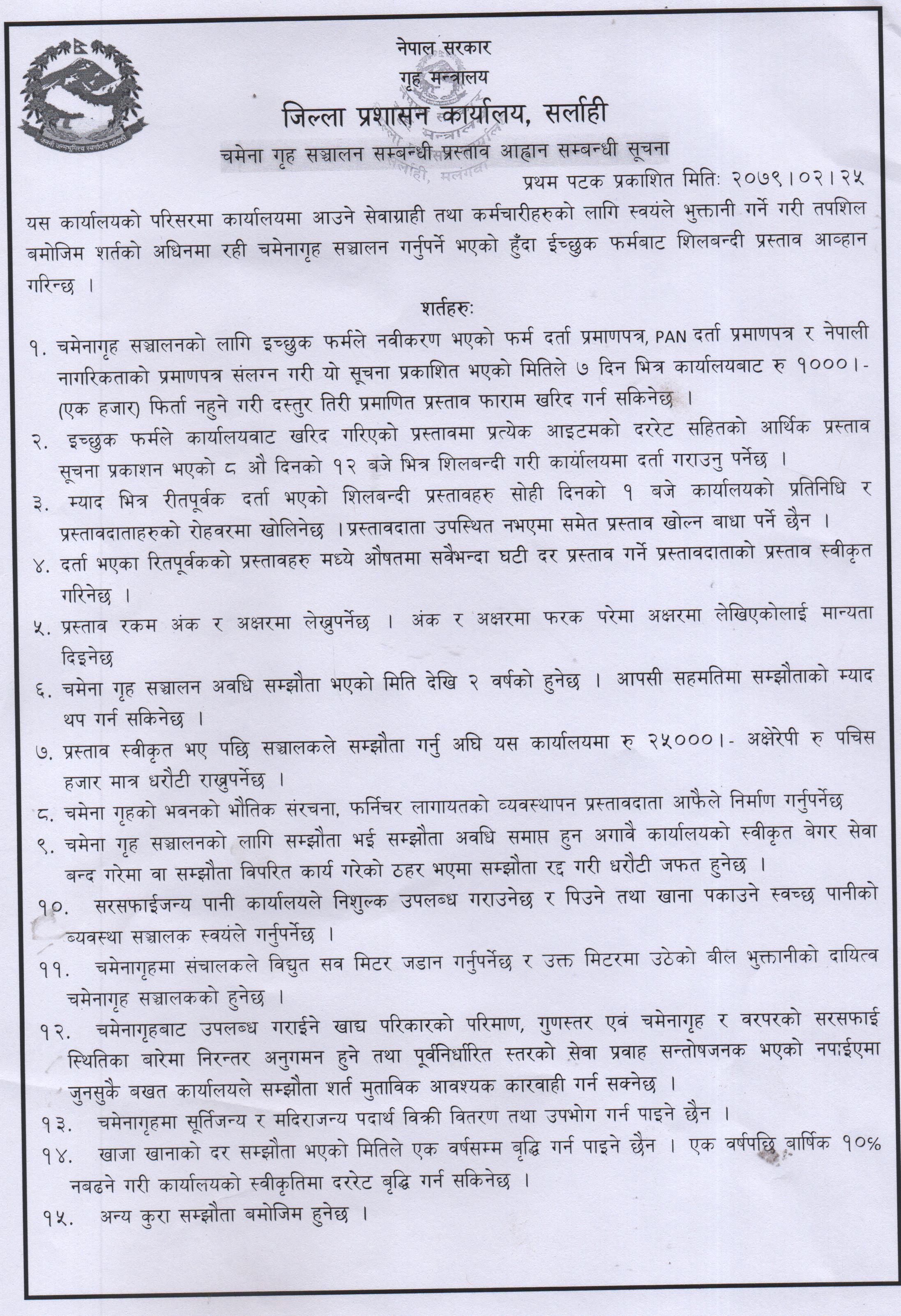 चमेना गृह सञ्चालन सम्बन्धी प्रस्ताव आह्वान सम्बन्धी सूचना ।