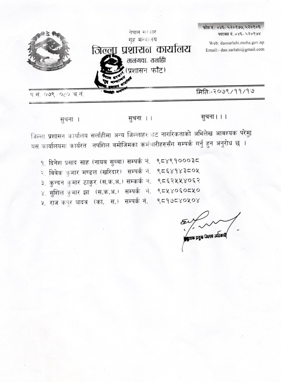 © सर्वाधिकार सुरक्षित जिल्ला प्रशासन कार्यालय, सर्लाही