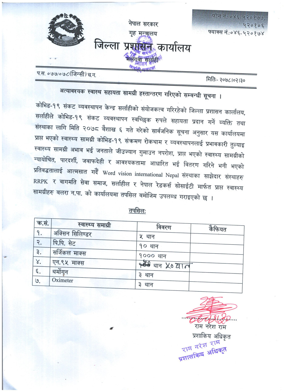 अत्यावश्यक स्वास्थ्य सहायता सामग्री हस्तान्तरण गरिएको सम्बन्धि सूचना ।