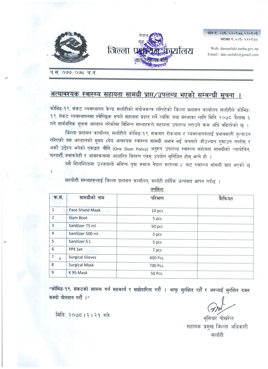 अत्यावश्यक स्वास्थ्य सहायता सामग्री प्राप्त/उपलब्ध भएको सम्बन्धी सूचना ।