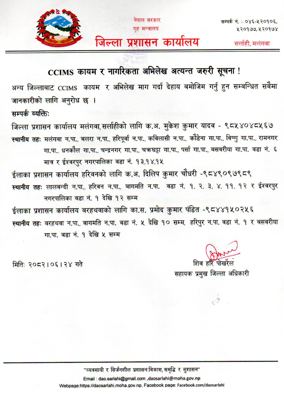 CCIMS कायम र नागरिकता अभिलेख अत्यन्त जरुरी सूचना !