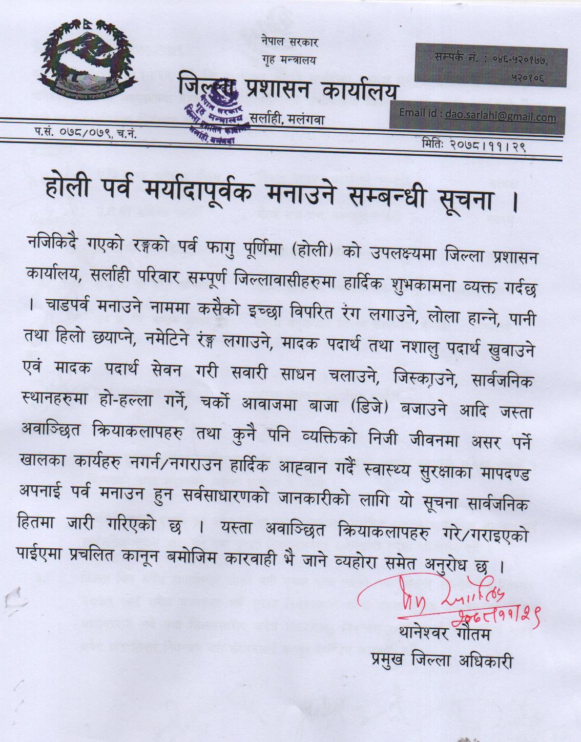 होली पर्व मर्यादापूर्वक मनाउने सम्बन्धी सूचना ।