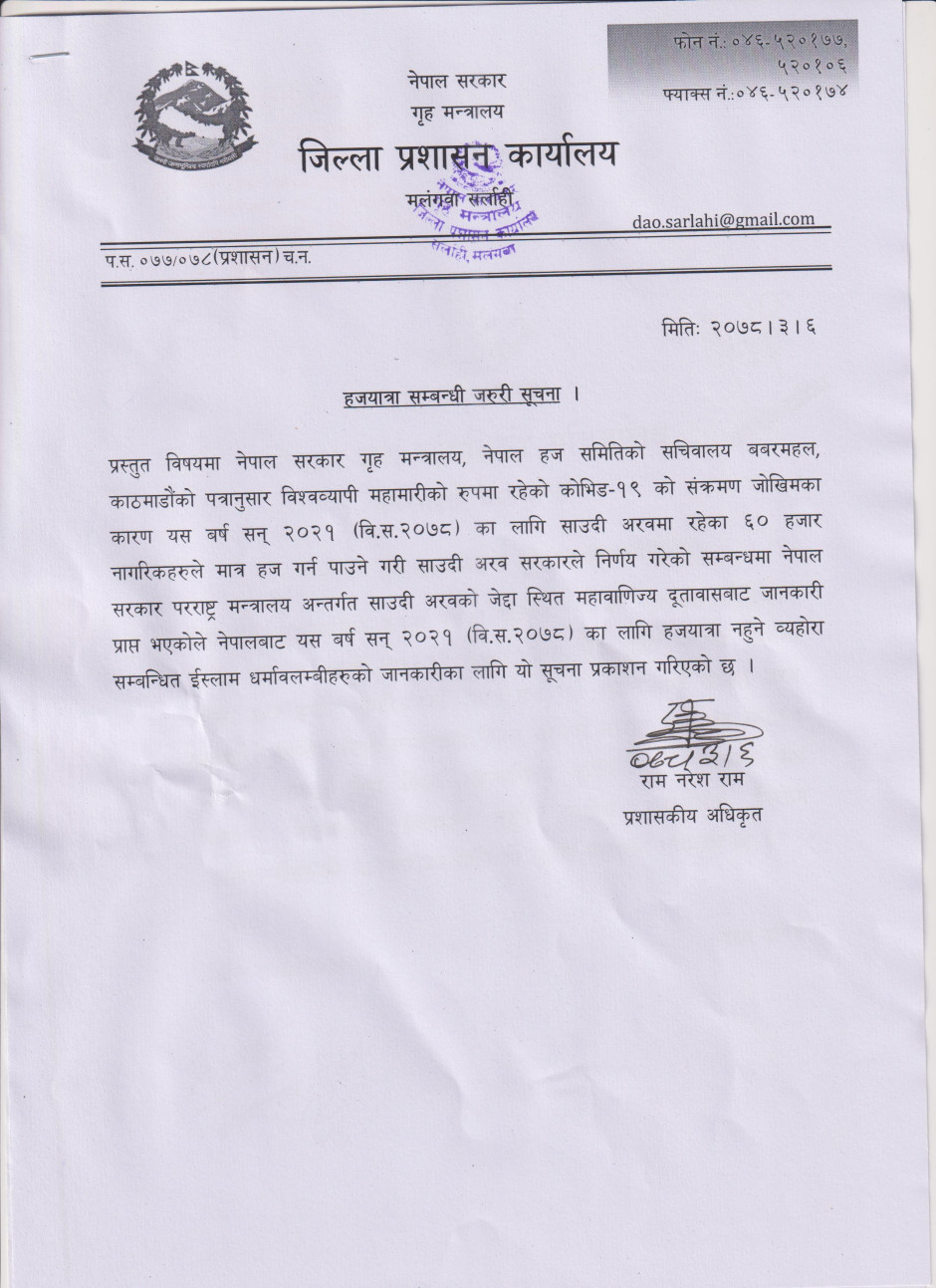 © सर्वाधिकार सुरक्षित जिल्ला प्रशासन कार्यालय, सर्लाही