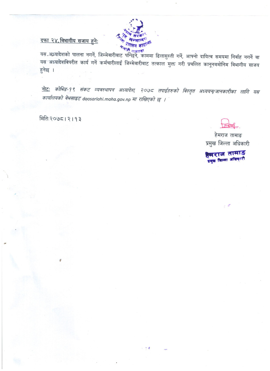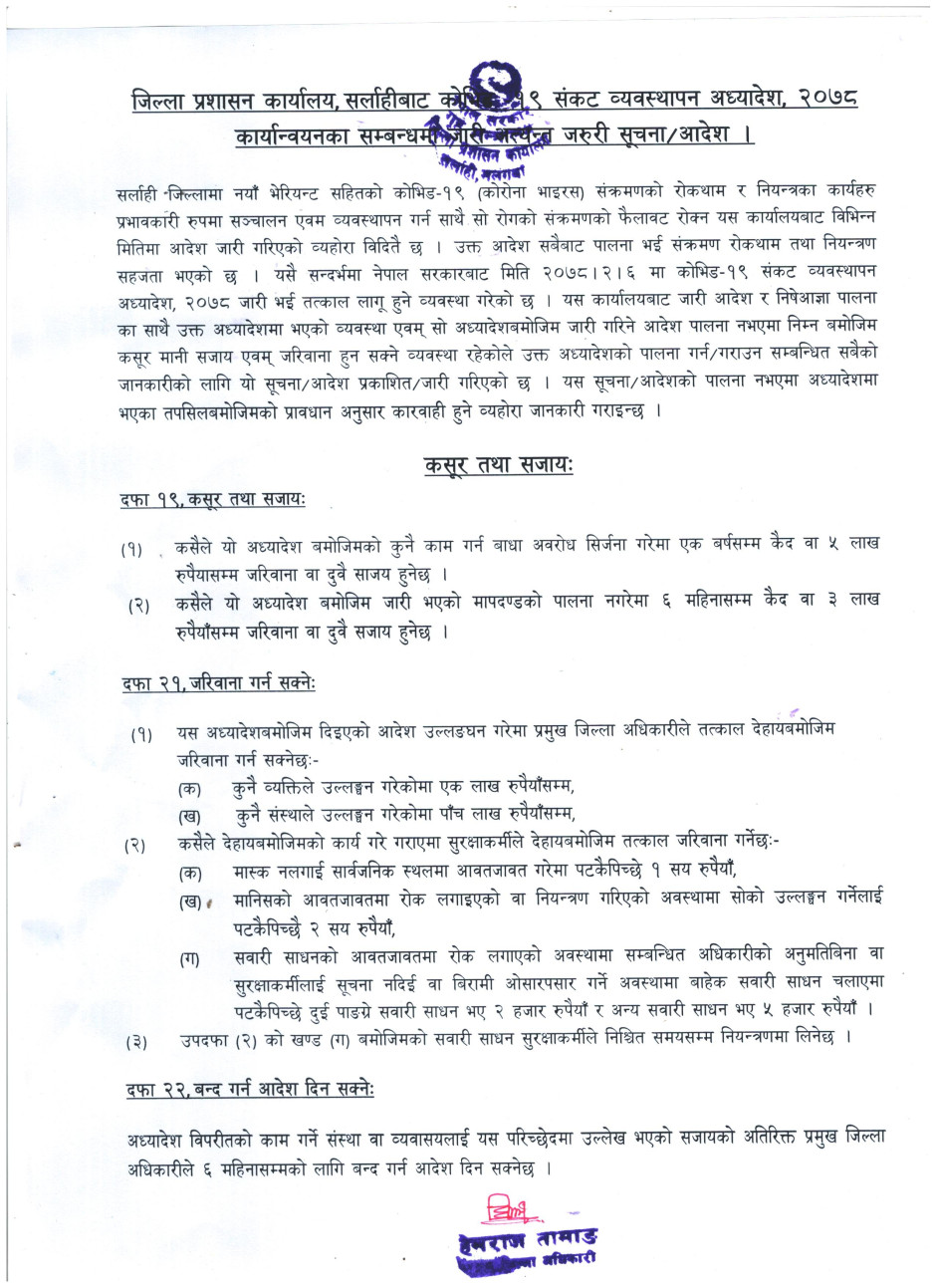 जिल्ला प्रशासन कार्यालय, सर्लाहीबाट कोभिड -19 संकट व्यवस्थापन अध्यादेश, २०७८ कार्यान्वयनका सम्बन्धमा जारी अत्यन्त जरुरी सूचना/आदेश ।