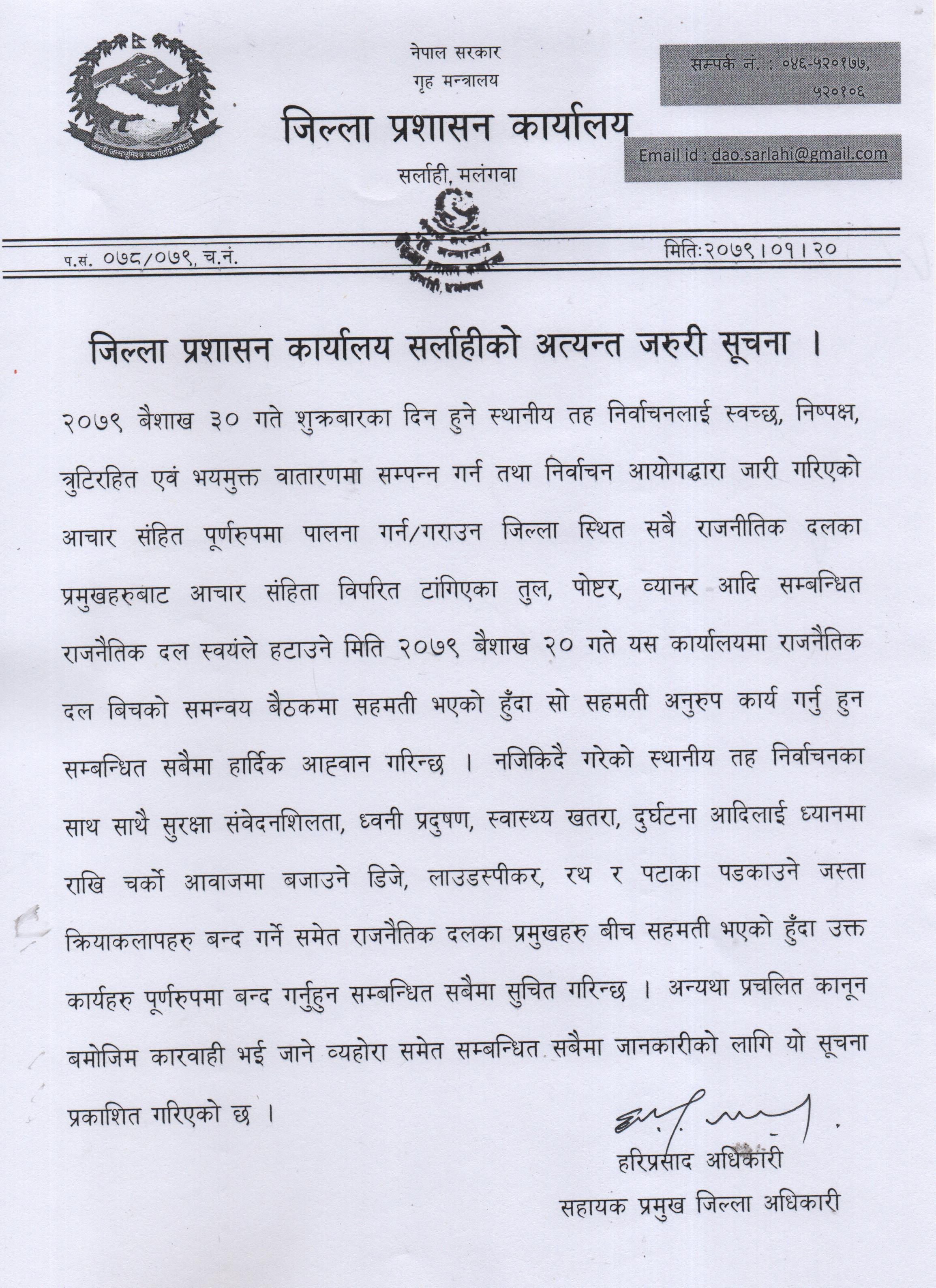 जिल्ला प्रशासन कार्यालय, सर्लाहीको अत्यन्त जरुरी सूचना ।