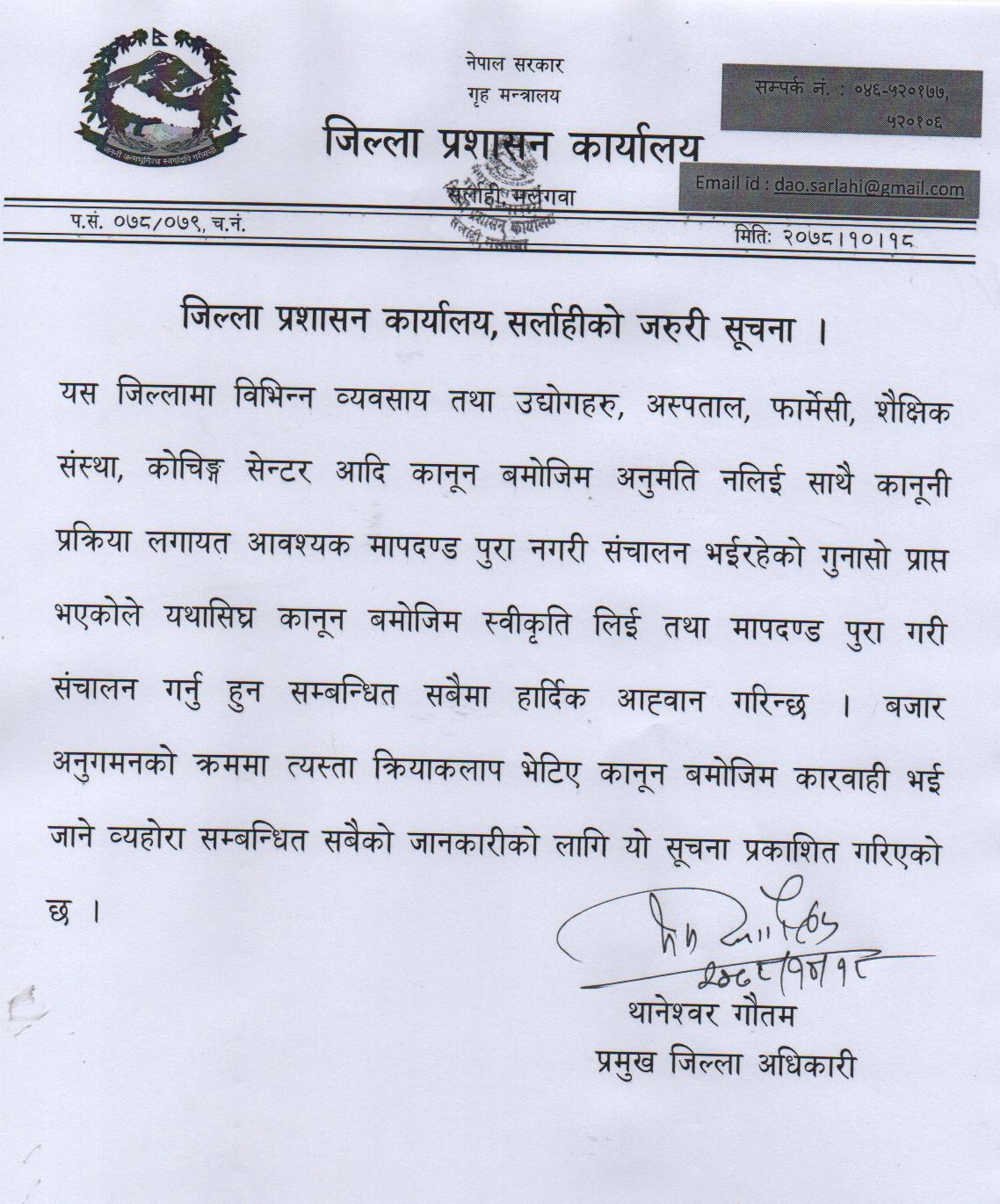 जिल्ला प्रशासन कार्यालय, सर्लाहीको जरुरी सूचना ।
