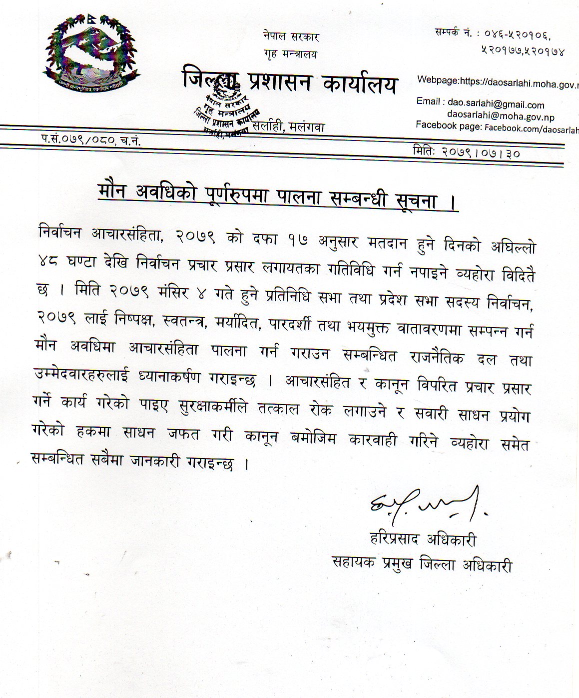 मौन अवधिको पूर्णरुपमा पालना सम्बन्धी सूचना ।