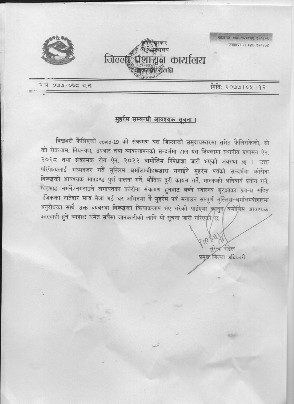 मुस्लिम धर्मालम्बीहरुले मनाउने मुहर्रम पर्व सम्बन्धी आवश्यक सूचना
