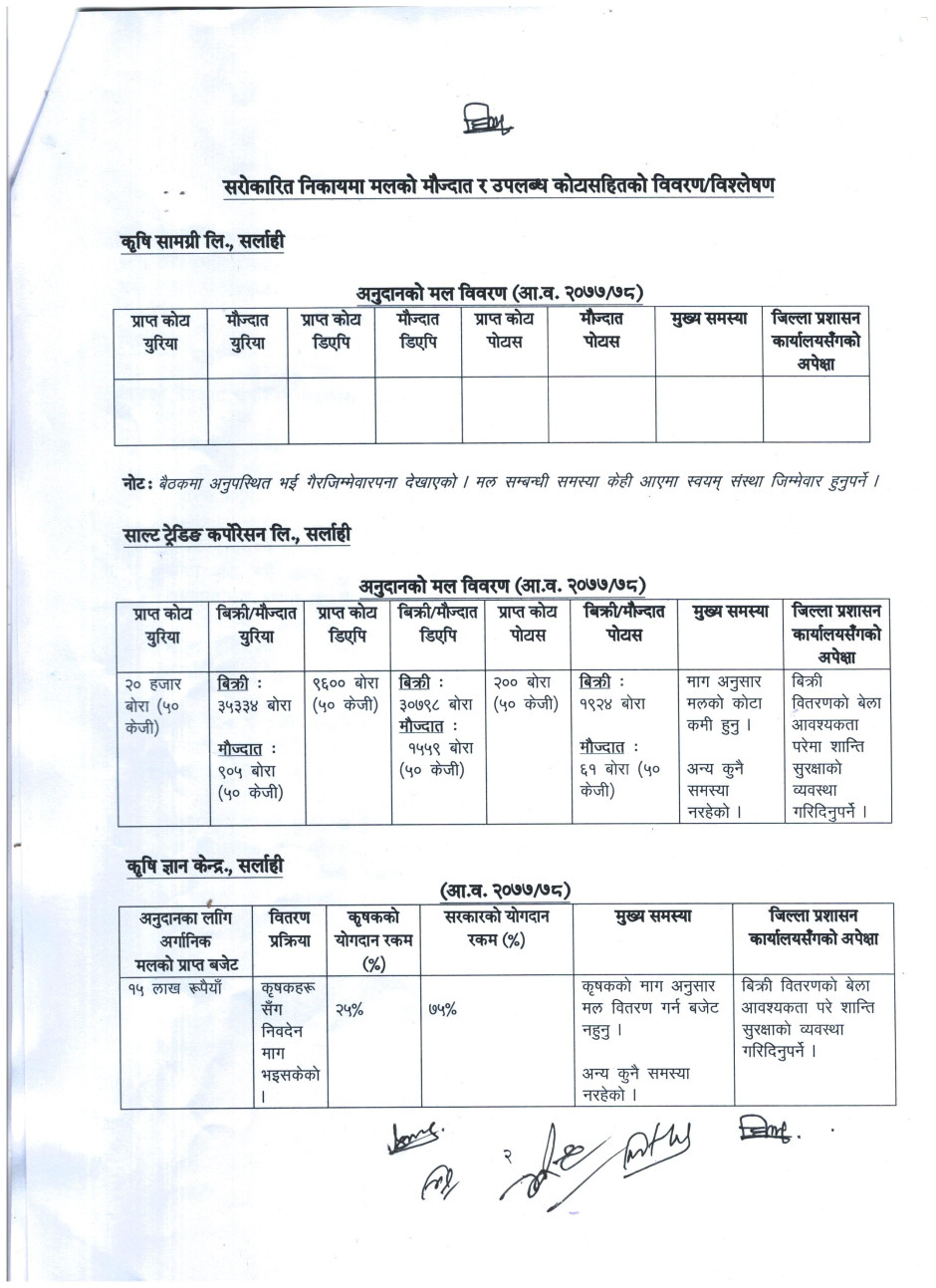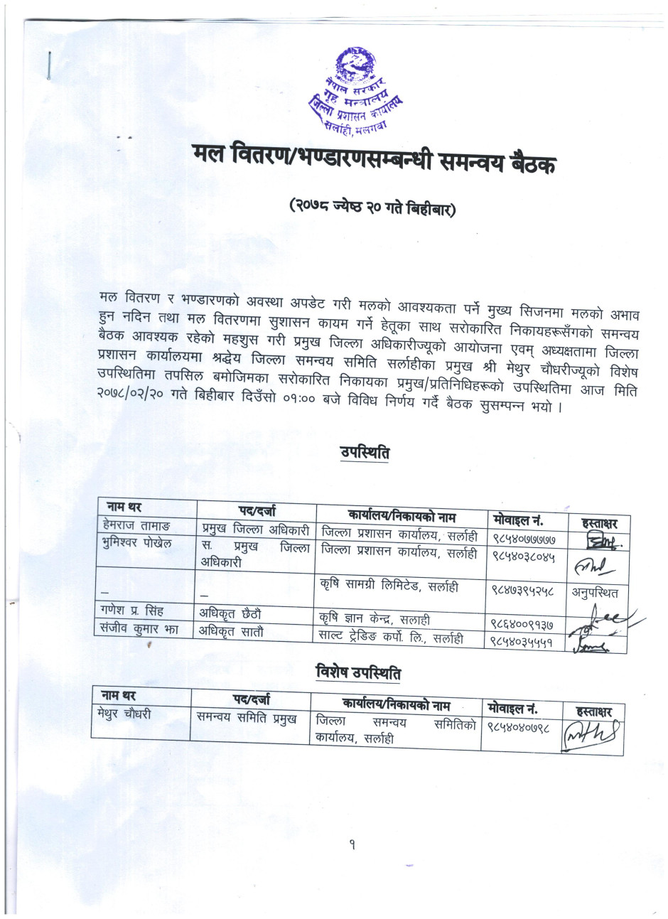 मिति २०७८।२।२० गतेका दिन बसेको मल बितरण /भण्डारण सम्बन्धि समन्वय बैठकको निर्णय