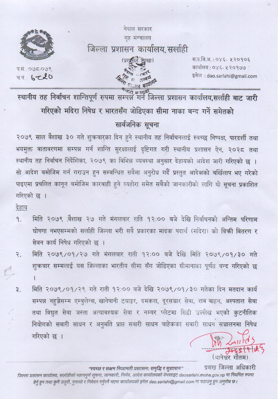 मदिरा निषेध तथा भारतसँग जोडिएका सीमा नाका बन्द सम्बन्धी अत्यन्त जरुरी सूचना ।