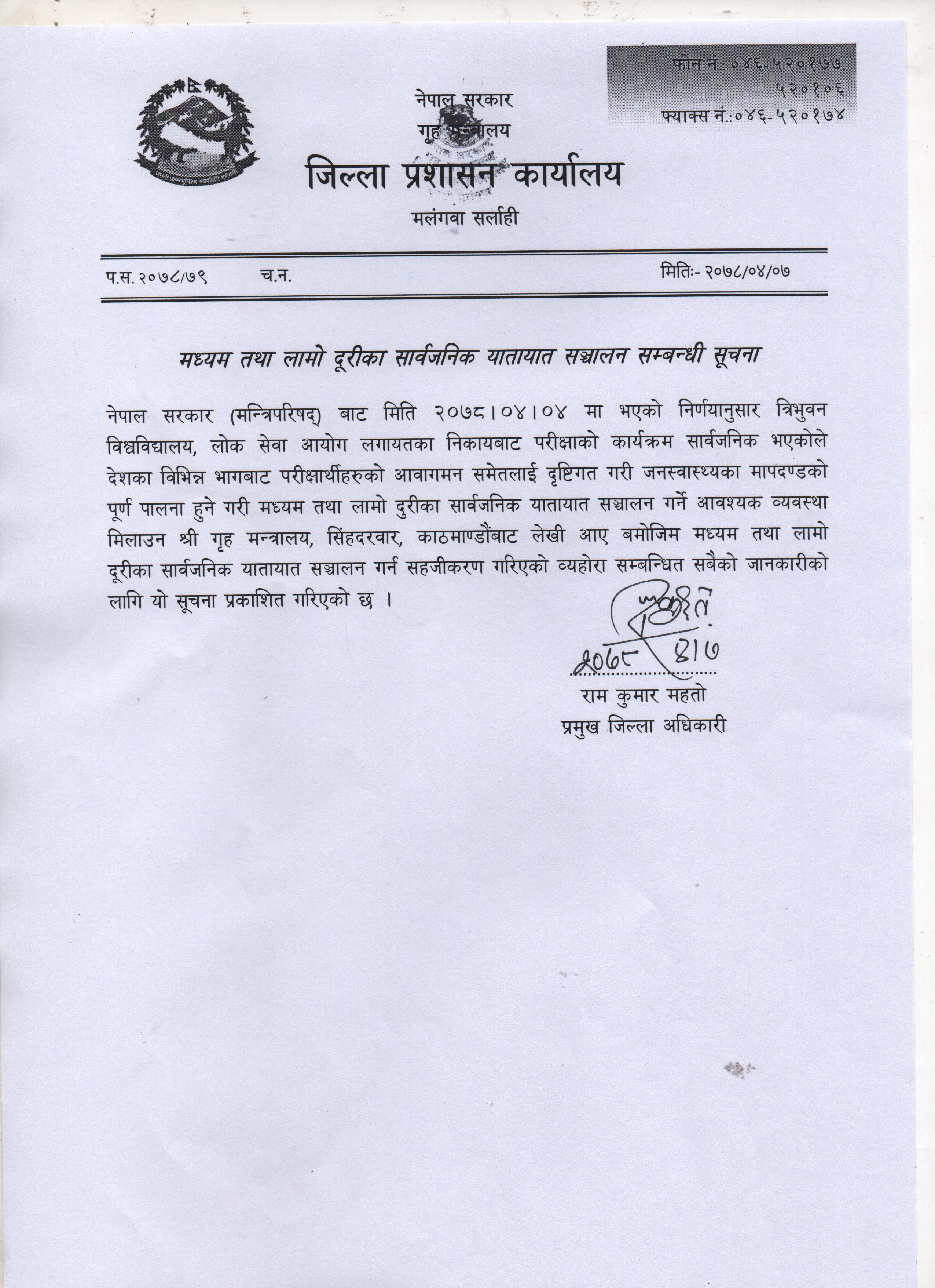 मध्यम तथा लामो दूरीका सार्वजनिक यातायात सञ्चालन सम्बन्धी सूचना