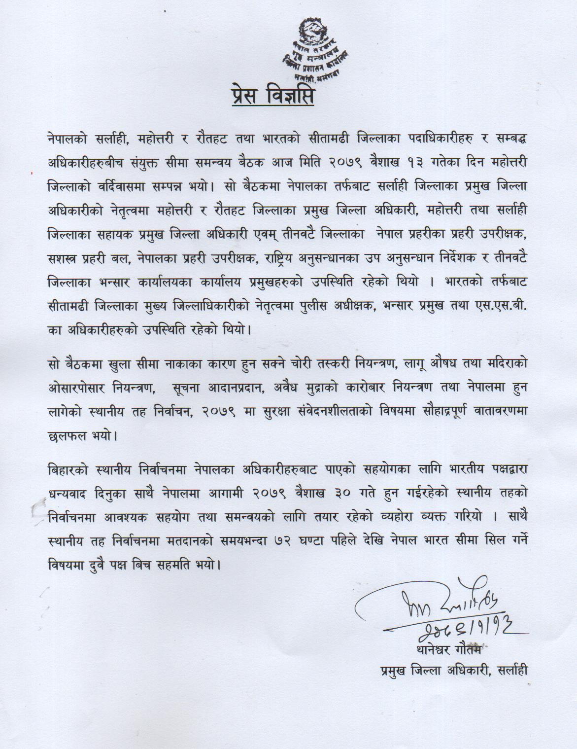 नेपाल भारत संयुक्त सिमा समन्वय बैठक सम्बन्धी प्रेस विज्ञप्ति ।
