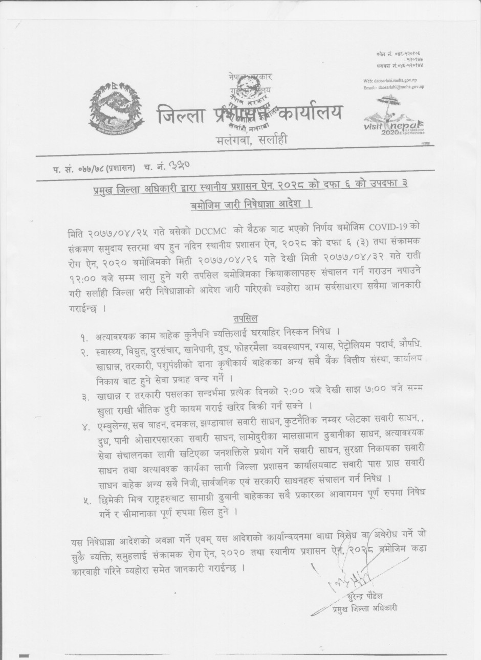 निषेधाज्ञा आदेश सम्बन्धी जिल्ला प्रशासन कार्यालय,सर्लाहीको जरुरी सूचना ।