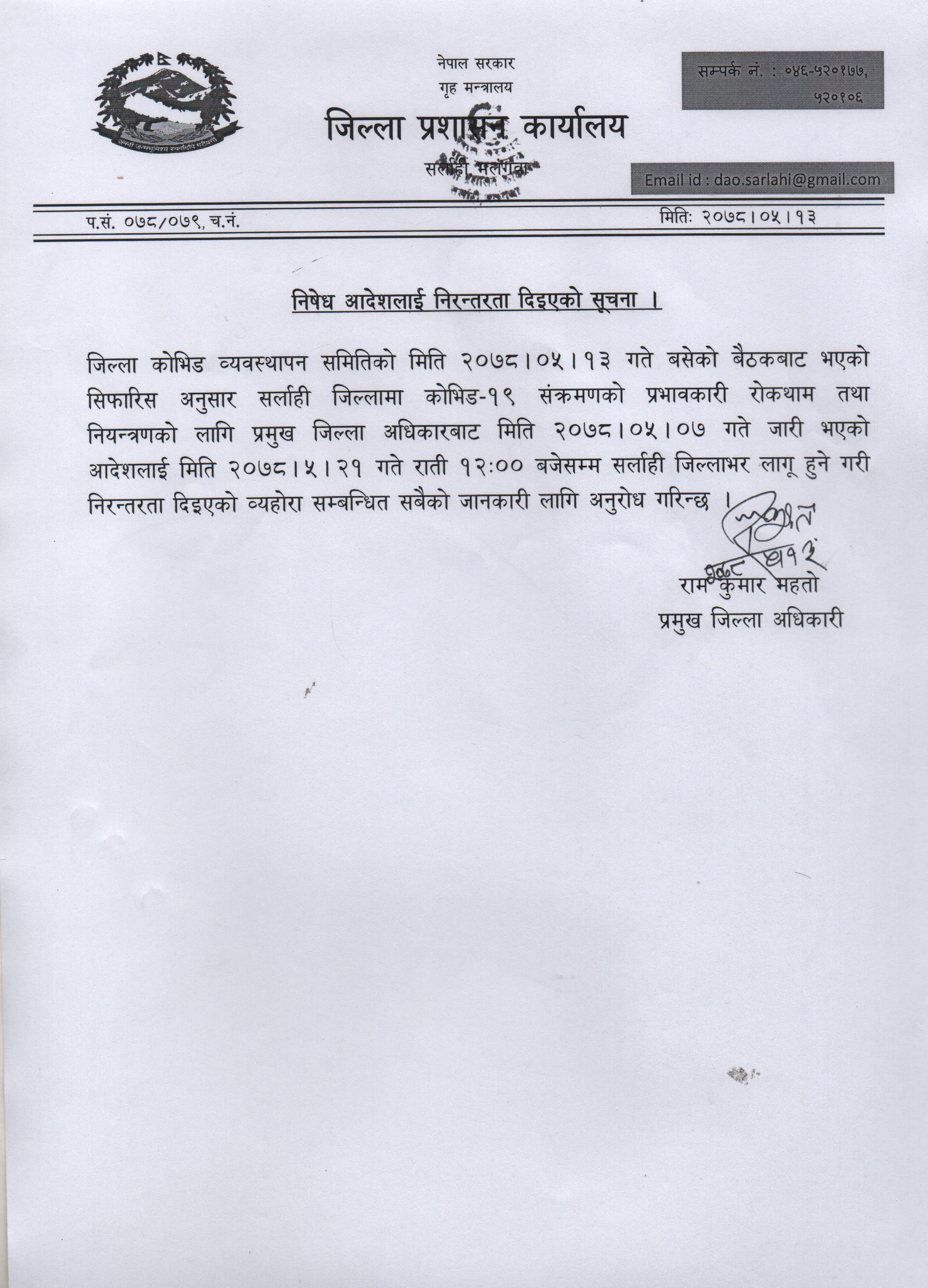 © सर्वाधिकार सुरक्षित जिल्ला प्रशासन कार्यालय, सर्लाही