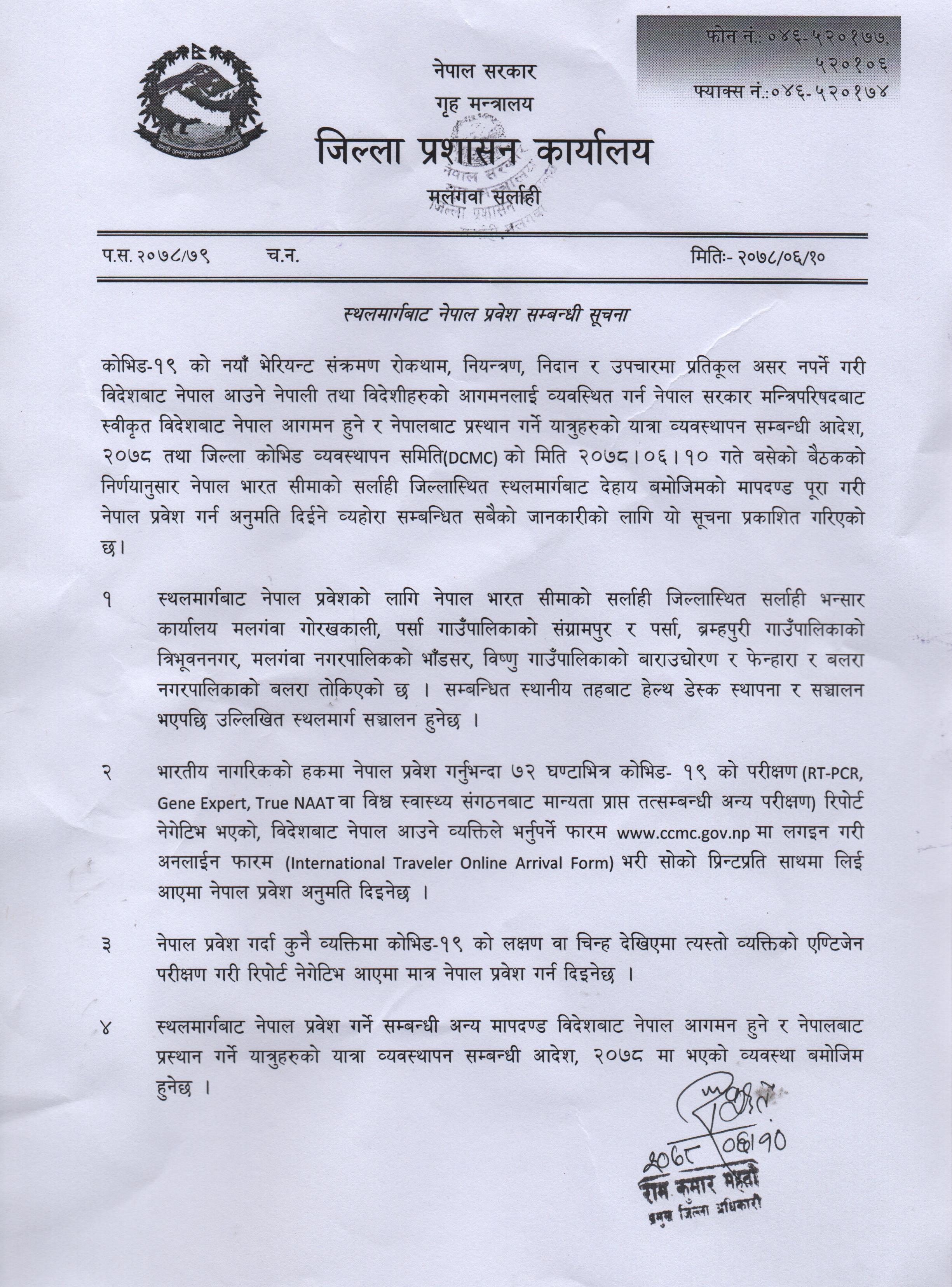स्थलमार्गबाट नेपाल प्रवेश सम्बन्धी जिल्ला प्रशासन कार्यालय, सर्लाहीको सूचना ।