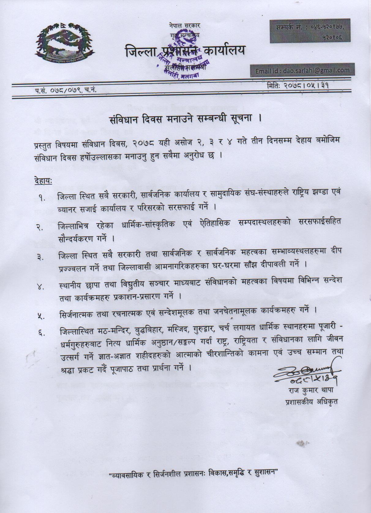 संविधान दिवस, २०७८ मनाउने सम्बन्धमा जिल्ला प्रशासन कार्यालय, सर्लाहीको सूचना ।