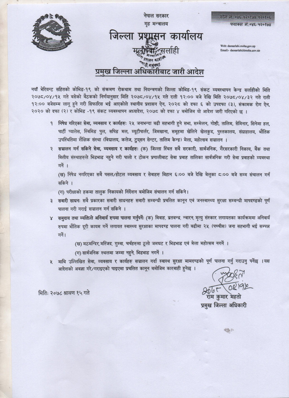 सर्लाही जिल्लाका प्रमुख जिल्ला अधिकारीबाट जारी आदेश ।