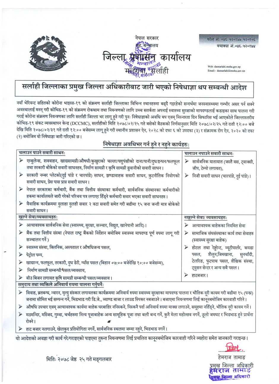 सर्लाही जिल्लाका प्रमुख जिल्ला अधिकारीबाट जारी भएको निषेधाज्ञा थप सम्बन्धी सूचना