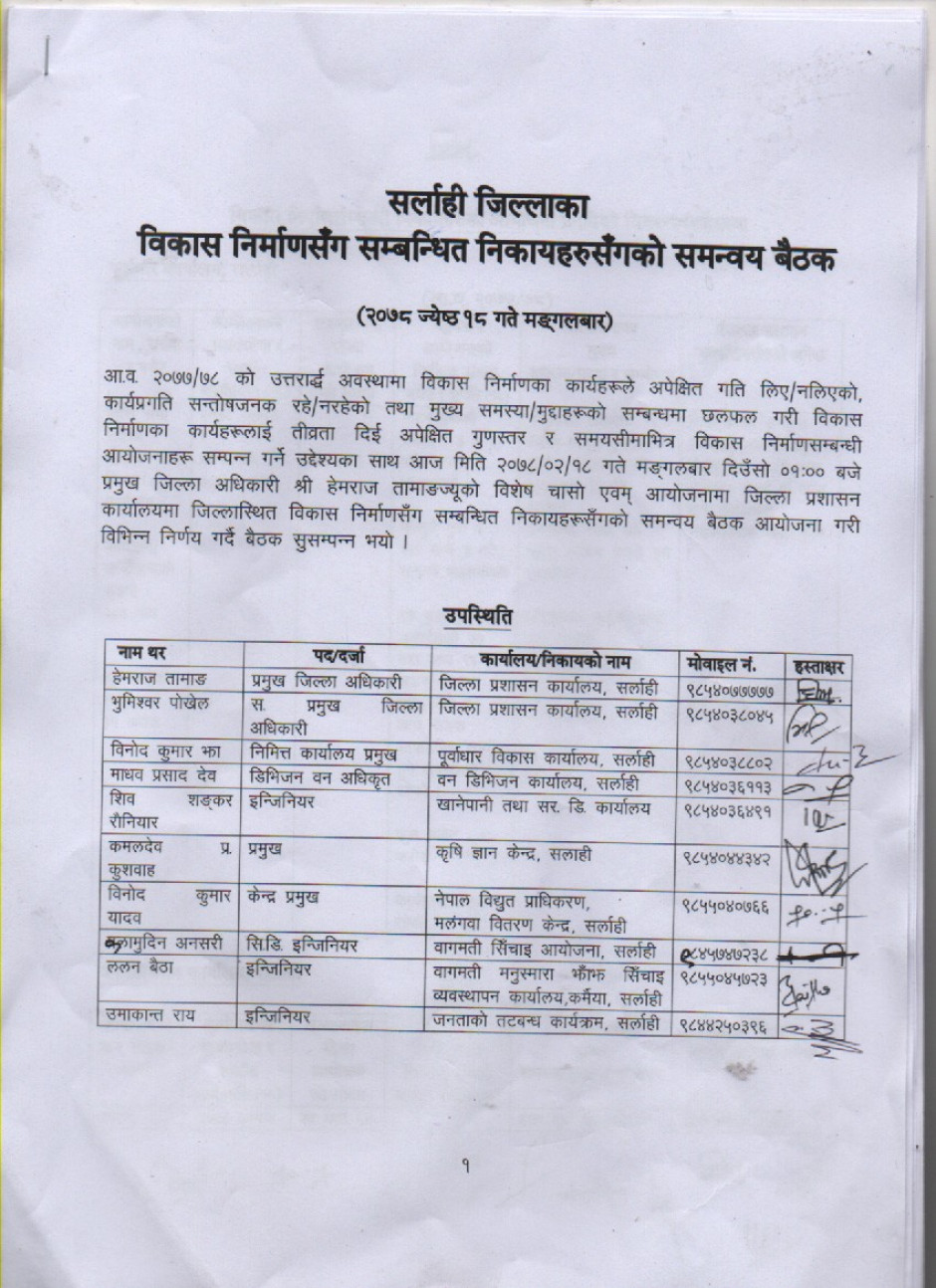 सर्लाही जिल्लाका विकास निर्माणसँग सम्बन्धित निकायहरुसँगको समन्वय बैठक मिति २०७८।०२।१८